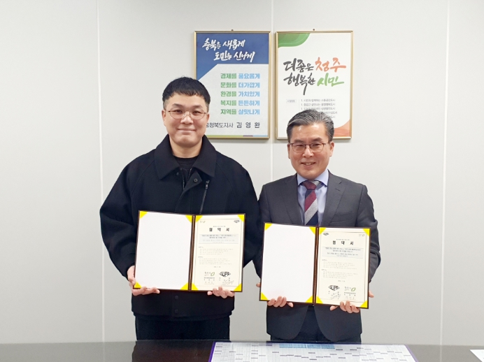 제2임시청사 청주시 문화체육관광국장실에서 열린 협약식에는 차영호 문화체육관광국장, 이인항 더지디자인 대표 등이 참석했다.