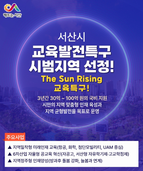 이완섭 서산시장은 “이번 교육발전특구 선정을 계기로 창의력과 미래 경쟁력을 갖춘 인재를 양성하고 지역 교육기관과 산업 일자리를 연계하는 공교육의 혁신을 이루겠다”며 “지역인재 양성이 지역 발전에 기여하고 지역 발전이 지역인재 양성에 기여하는 선순환 체계를 구축해 교육을 선도하는 도시로 도약할 수 있도록 사업 추진에 최선을 다하겠다”고 밝혔다.