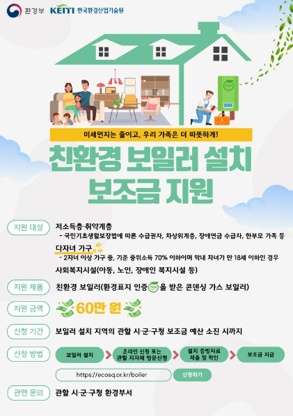 가정용 친환경보일러는 가스 소비량 70KW 이하인 콘덴싱 가스보일러로 한국환경산업기술원의 환경표지 인증을 받은 제품을 의미한다. 일반 보일러 대비 에너지 효율이 12% 이상 높아 연간 난방비 최대 13만원 절감 및 연간 온실가스 배출량 200kg 감축 효과를 얻을 수 있다.