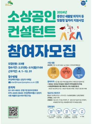 ‘소상공인 컨설턴트’는 모집 분야별 3년 이상 경력자로, 총 23명 선발 예정이다. 모집 경력 분야는 ▲대출 상담, 매출 및 비용분석, 세무 상담 등 재무 및 세무 ▲근로기준법, 4대 보험, 급여명세서 작성 등 노무 ▲광고, 홍보, 디자인 제작 지원 등 디지털마케팅이다.