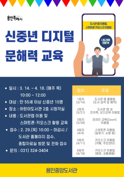 내달 14일부터 4월 18일까지 매주 목요일 2시간씩 15명을 대상으로 진행하는 이번 프로그램에서는 도서관 앱과 스마트폰, 키오스크 이용법을 총 6회에 걸쳐 안내한다.