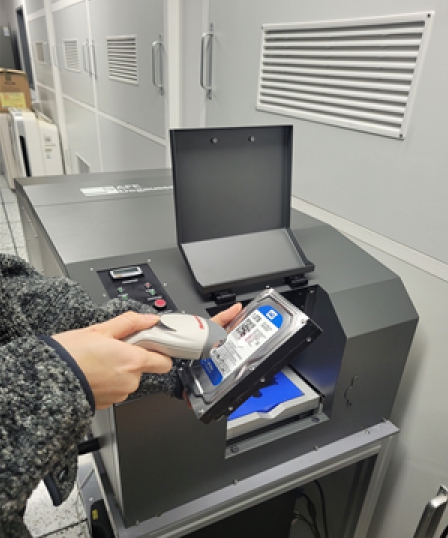 ![]() 교육청 담당자가 학교 저장매체에 대해 디가우징을 하고 있다. |