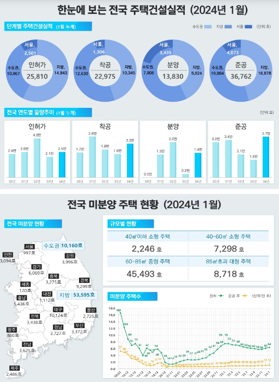 (미분양) 1월말 기준 미분양 주택은 총 63,755호로, 전월(62,489호) 대비 2.0%(1,266호) 증가했다. 준공 후 미분양은 11,363호로 전월(10,857호) 대비 4.7%(506호) 증가했다.