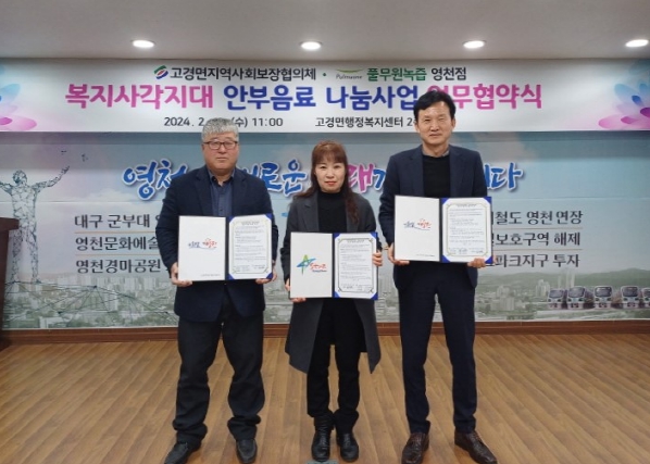 ![]() 고경면지역사회보장협의체는 지난 28일 풀무원녹즙 영천점과 안부음료 배달사업에 대한 업무협약을 체결했다. |