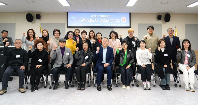![]() 29일 체육회관 중회의실에서 열린 2024년도 생활체육 프로그램 사업 전담 지도자 위촉장 수여식에 참석한 전갑수 체육회장과 생활체육지도자들이 파이팅을 외치고 있다. |