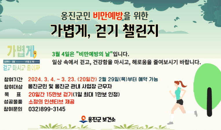 보건소 관계자는 “ 3월 4일 비만예방의 날을 맞이하여 운영하는 이번 걷기 챌린지를 통해 군민의 건강생활실천 및 비만 인식개선이 될 수 있도록 많은 관심과 참여를 바란다”고 말했다.