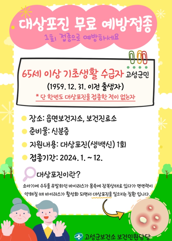 대상자는 고성군에 1년 이상 주민등록을 둔 65세 이상 기초생활수급자이며, 과거 대상포진 예방 접종력이 있는 경우 제외된다.
