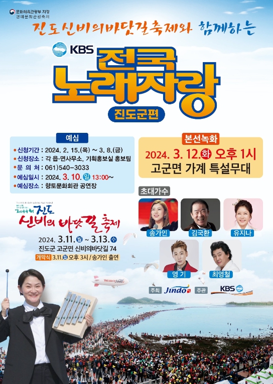진도군이 오는 3월 12일 고군면 가계해수욕장 특설무대에서 ‘KBS 전국노래자랑’을 개최한다.