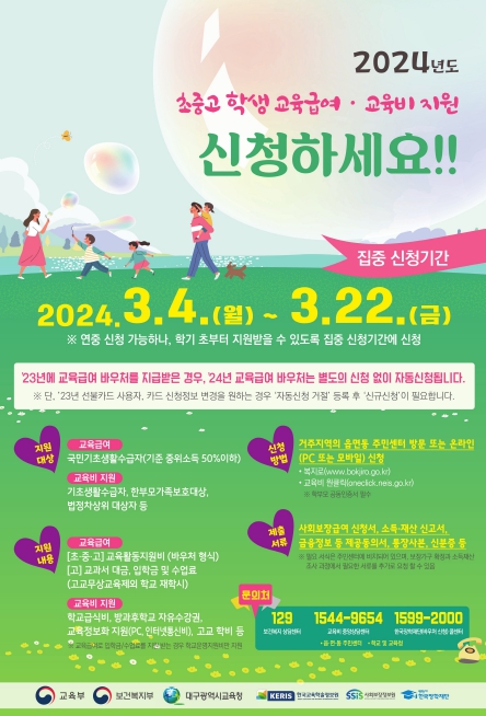 ![]() 대구시교육청, 2024학년도 초ㆍ중ㆍ고 학생 교육급여 및 교육비 지원 |