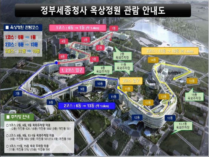 옥상정원 관람은 1일 총 3회(회차당 90분간), 세종시의 문화관광해설사와 숲 해설자의 인솔 관람으로 진행된다. 3개 관람코스의 특징은 다음과 같다.