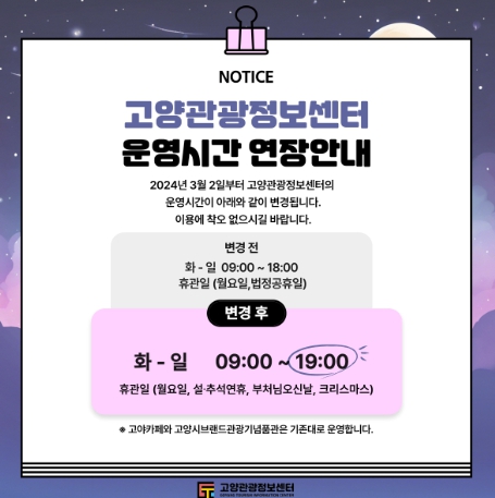 ![]() 고양관광정보센터 운영시간 연장 안내문 |