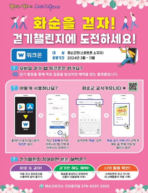 챌린지 참여는 워크온 앱 설치, 화순군 공식 커뮤니티 가입, 챌린지 화면에서 ‘예약하기’ 또는 ‘참여하기’를 선택한 후 스마트폰을 소지하고 걸으면 된다.