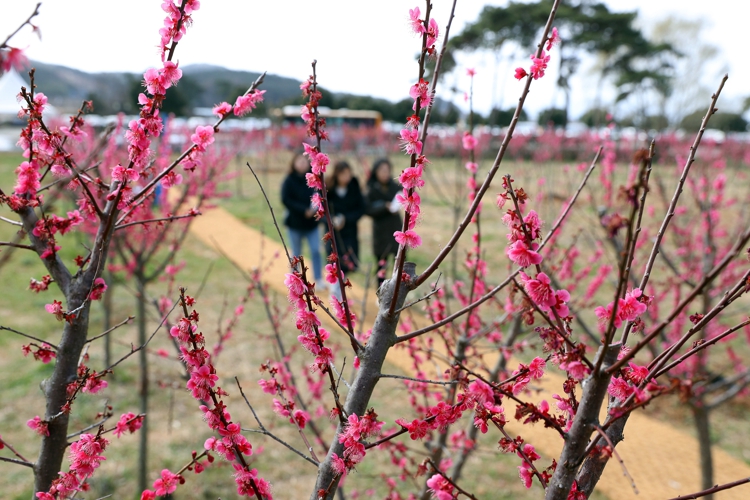 축제장 남문 입구에 조성된 매화 밭에 만개한 홍매화가 관광객의 발길을 사로잡으면서 봄의 꽃을 피우고 있다.