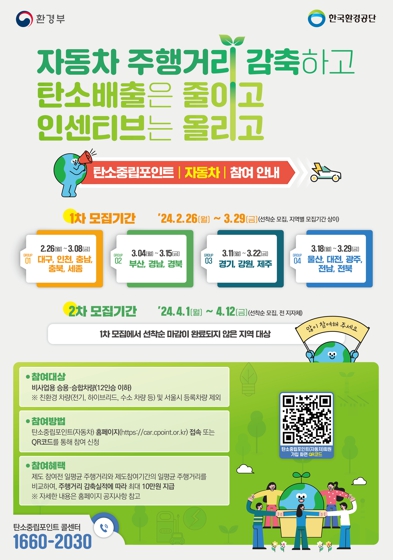 신청기간은 3월 4일부터 3월 15일까지이며, 자동차 탄소중립포인트제 누리집에서 회원가입 후 참여할 수 있다. 참여대상은 △12인승 이하 비사업용 승용자동차·승합자동차로 △소유주 기준 1인당 1대 차량만 참여할 수 있으며 △친환경자동차(전기, 수소, 하이브리드) 및 법인⋅단체차량의 경우에는 제외된다.