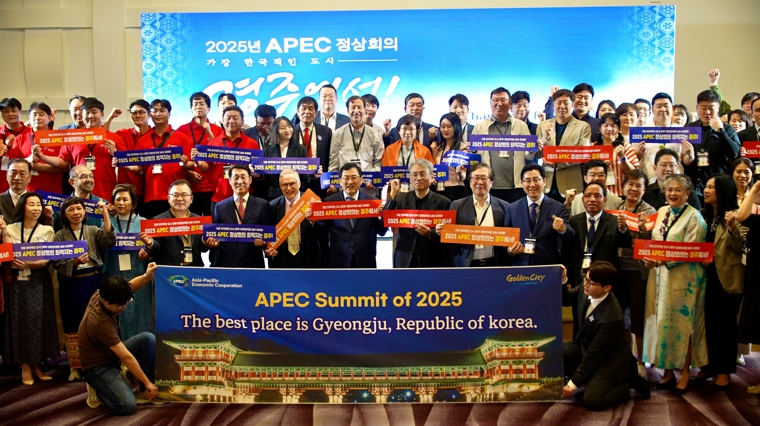 ![]() 주낙영 시장을 포함한 아시아 축제도시 컨퍼런스 참석자들이 지난 29일 행사 종료 후 2025 APEC 정상회의 경주유치 퍼포먼스를 펼치고 있다 |