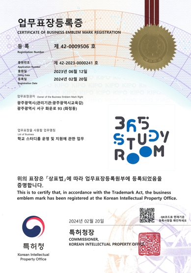 ‘365-스터디룸’은 시교육청 대표 브랜드로 타 기관과 단체에서 영리목적 사용을 차단하고 공공성을 확보하기 위해 업무표장 등록을 추진했다. 업무표장은 비영리 업무를 하는 자가 그 업무를 나타내기 위해 사용하는 상표이다. 지난해 5월 상표 출원해 등록 완료까지 9개월의 시간이 소요됐으며 등록일로부터 10년간 지식재산권(상표사용권)이 존속된다.
