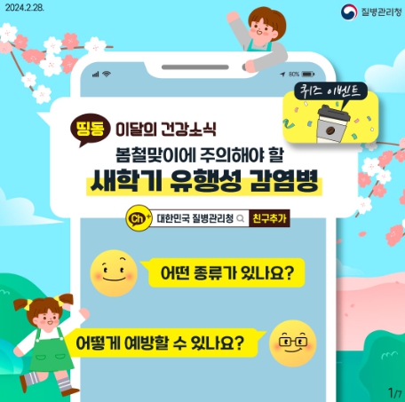 새학기 유행성 감염병에 대한 더 자세한 내용은 질병관리청 누리집에서, 매달 새로운 건강 지식을 알려주는 이달의 건강소식은 카카오톡 채널 ‘대한민국 질병관리청’을 추가하고 메시지로 받아보세요.