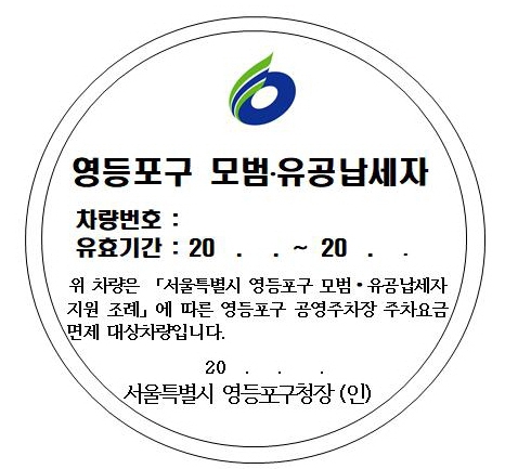 ![]() 영등포구 모범·유공납세자에게 배부되는 주차요금 면제 스티커 |