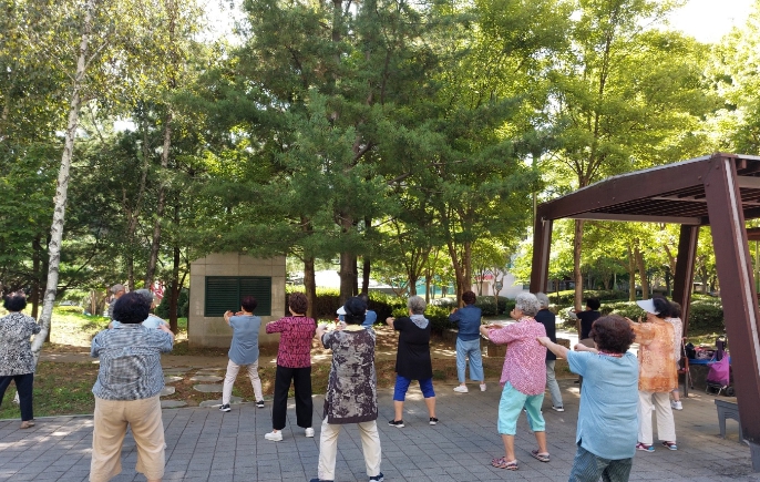 ![]() 상현공원에서 기체조 교실이 열리고 있다. |