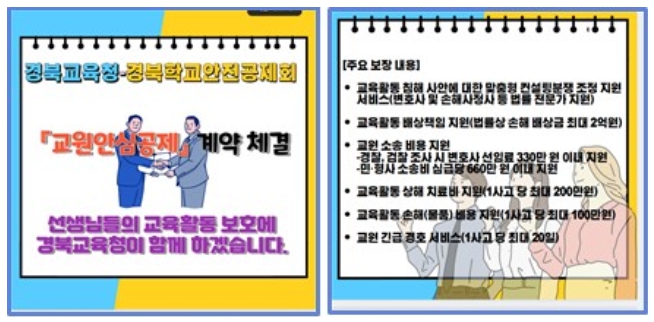 한편, 경북교육청은 ‘교원안심공제’ 사업 외에도 교육활동 보호 강화를 위한 ‘2024년 교육활동 보호 종합 계획’을 마련해 학교에 안내할 계획이며, 교원의 정당한 교육활동 보호를 위한 제도 개선과 교육 주체 간의 상호존중 문화 조성을 위한 노력도 함께 지속해서 이어 나갈 방침이다.
