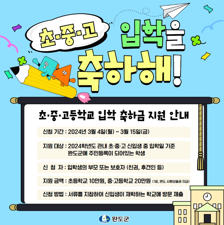 ![]() 완도군, 올해도 관내 학교 입학생에 축하금 지원 |