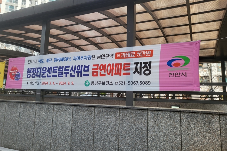 이번에 금연아파트로 지정된 행정타운센트럴두산위브 아파트에는 현판과 현수막, 금연구역 안내표지가 지원된다. 6개월간의 계도 및 홍보 기간을 거쳐 오는 9월 10일부터 복도, 계단, 엘리베이터, 지하주차장에서 흡연행위 적발 시 5만원의 과태료가 부과된다.