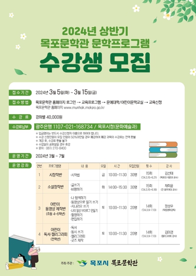 ![]() 목포문학관이 상반기 교육 프로그램을 마련하고 수강생을 모집한다. |