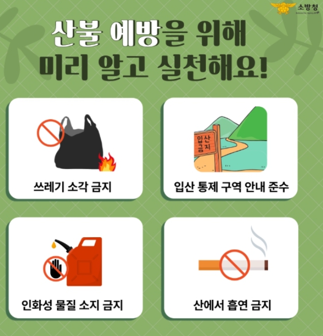 겨울과 봄철은 강한 바람과 건조한 날씨로 인해 산불위험이 높고 산불화재 특성상 작은 화재가 대형화재로 이어질 가능성이 높기 때문에 각별한 주의가 필요하다.