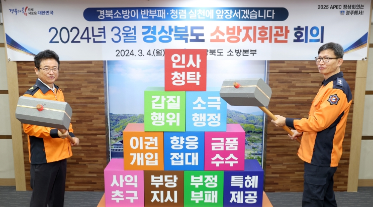 회의에 앞서 공정하고 신뢰받는 경북소방 구현을 위한 반부패·청렴 실천 구호를 제창하고 부패 척결 퍼포먼스를 진행하며 전국 소방분야 청렴도 1등급 목표 달성의 의지를 다졌다.