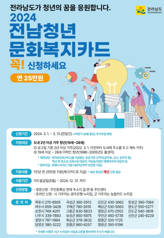 ![]() 곡성군 전남청년 문화복지카드 지원사업 모집. |