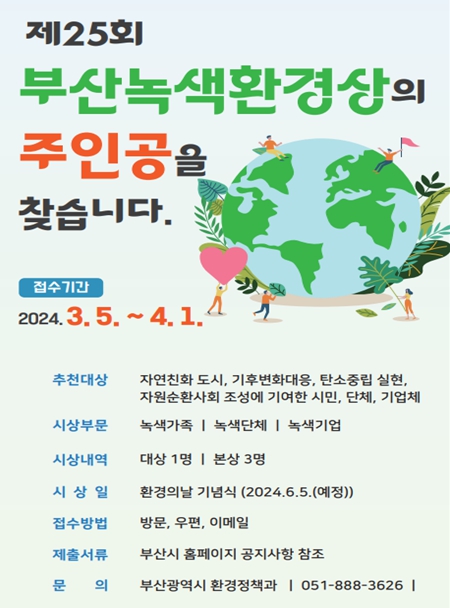 이병석 시 환경물정책실장은 “우리시는 탄소중립 실현과 자연친화 도시 부산을 만드는 데 선도적인 역할을 해주신 개인·단체를 발굴해 부산녹색환경상을 시상하고 있다”라며, “부산의 환경을 지키기 위해 열심히 활동하시는 분들의 노고가 널리 알려질 수 있도록, 이번 후보자 모집에 많은 관심과 참여를 부탁한다”라고 당부했다.