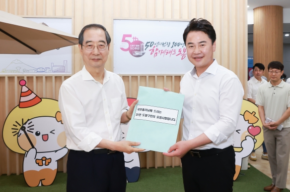 ![]() 오언석 도봉구청장(오른쪽)이 한덕수 국무총리(왼쪽)에게 창동민자역사와 관련한 도봉구의 요청사항을 전달하고 있다 |