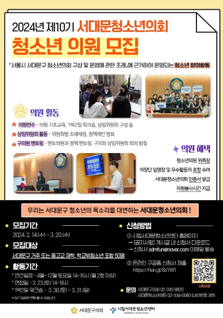 '서대문청소년의회 제10기 청소년의원'은 공개 모집을 통해 50명을 선발하며, 모집기간은 오는 3월 20일까지이다.