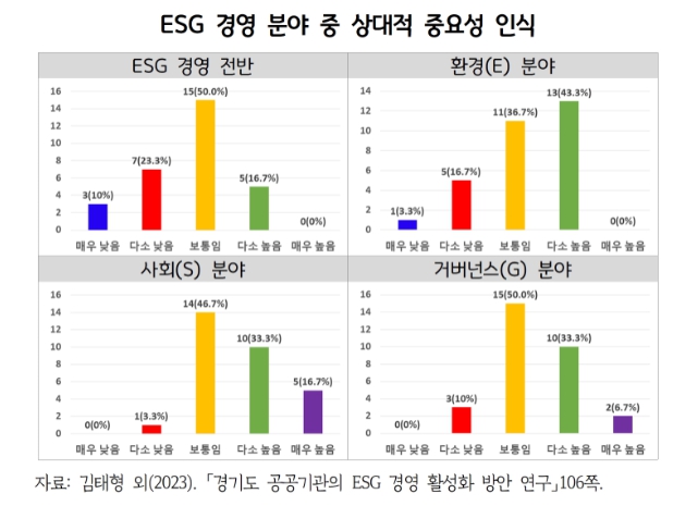 경기연구원은 2023년 10월 6~23일 경기도 공공기관 28개의 경영평가와 ESG 경영 담당자 34명을 대상으로 ESG 경영 현황에 대한 인식조사 내용을 담은 ‘경기도 공공기관의 ESG 경영 활성화 방안 연구’ 보고서를 발간했다고 5일 밝혔다.
