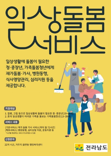 이상심 전남도 보건복지국장은 “혼자서 일상생활이 어려웠던 청·중장년이나 아픈 가족을 돌보는 가족돌봄 청년이 일상돌봄서비스를 통해 삶의 질을 높일 것으로 기대한다”며 “사업 초기인 만큼 이용자 확보와 서비스 체계 구축에 힘써 돌봄이 필요한 도민에게 폭넓은 복지서비스를 제공토록 하겠다”고 말했다.