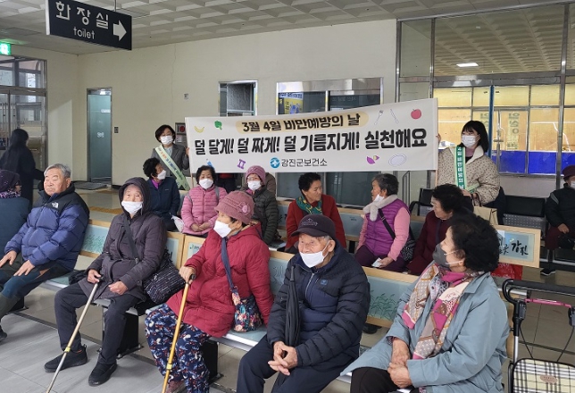 걷기운동 챌린지는 모바일 걷기 앱을 통해 3월 1일부터 3월 25일까지 25일간 목표걸음 20만보 달성자에게 보상품을 제공하고 강진버스터미널 등 다중이용시설을 방문해 덜 짜게, 덜 달게, 덜 기름지게 먹기, 채소 자연식품 섭취하기 등 건강한 식습관 실천방법을 홍보했다.