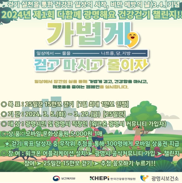 안승필 건강생활과장은 “걷기 활동은 특별한 기술이나 장소 제약 없이 언제 어디에서 누구나 할 수 있는 가장 기본적인 운동”이라며 “건강 걷기 챌린지를 통해 많은 시민이 걷기에 참여하여 비만 예방관리에 도움이 되길 바란다”고 전했다.