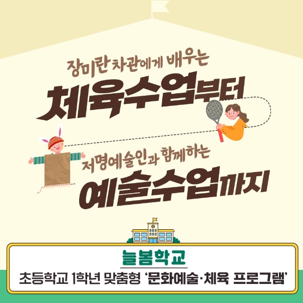 문화체육관광부는 초등학교 1학년부터 질 높은 문화예술·체육을 접할 수 있도록 ‘늘봄학교’ 운영에 필요한 다양한 프로그램을 제공하겠습니다.