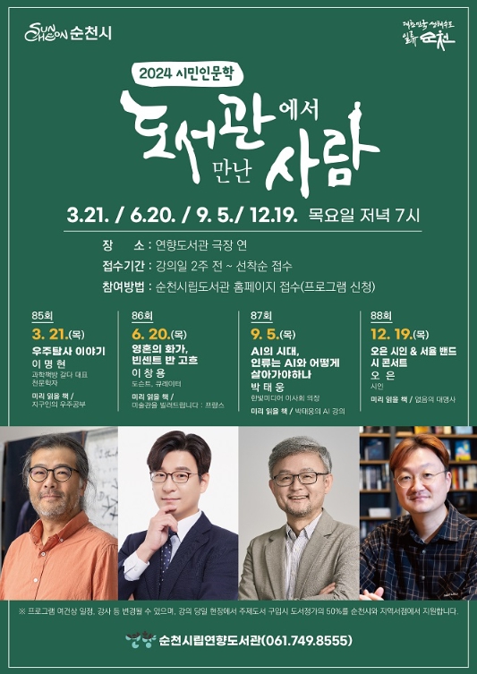 한편, 시민인문학 강좌는 3월 이명현 천문학자를 시작으로 6월 20일 이창용 도슨트의‘영혼의 화가, 빈센트 반 고흐’, 9월 5일 박태웅 한빛미디어이사회 의장의 ‘AI시대, 인류는 AI와 어떻게 살아가야하나’강의가 이어지며, 12월 19일 오은 시인과 서율밴드가 함께하는 시 콘서트로 2024년 시민 인문학을 마무리할 예정이다.