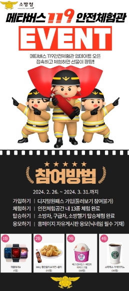 이벤트에 참여하기 위해서는 ▲디지털원패스 회원가입 ▲안전체험 13종 체험 및 수료증 발급 ▲소방차고(소방차, 구급차)·장비전시공간(소방헬기) 탑승체험을 완료하고 홈페이지 자유게시판에 응모(닉네임 기재 필수)하면 된다.