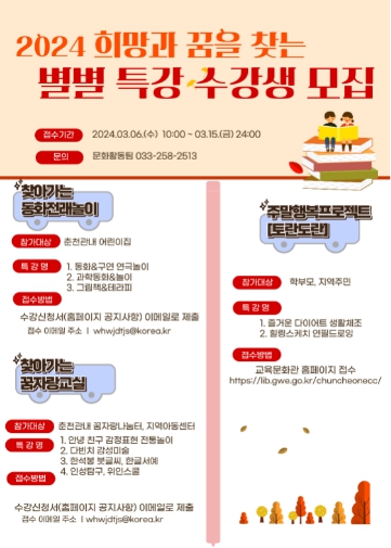 ![]() 2024 희망과 꿈을 찾는 별별 특강 수강생 모집 안내문 |