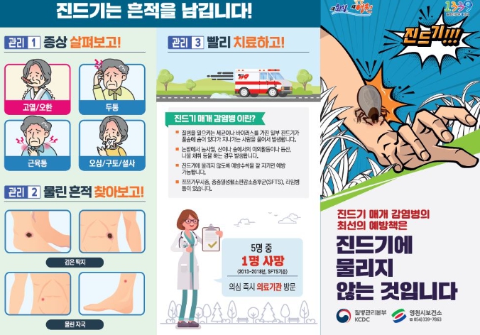 영천시보건소 관계자는 "최근 따뜻한 날씨에 야외활동하는 시민들이 늘고 있어 참진드기 물림에 더욱 주의가 필요하다."라며 "SFTS에 무조건 감염되는 것은 아니지만 물린 후 38도 이상 고열, 구토, 설사 증상이 동반되면 지체 없이 병원을 찾아 진료를 받아야 한다."라고 말했다.