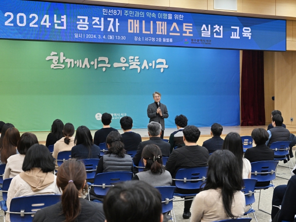 이번 특강은 김이강 서구청장을 비롯해 공약사업 팀장과 담당자 등 70여 명이 참석한 가운데 매니페스토에 대한 이해를 높이고 공약사업을 성실히 이행하기 위해 마련됐다.