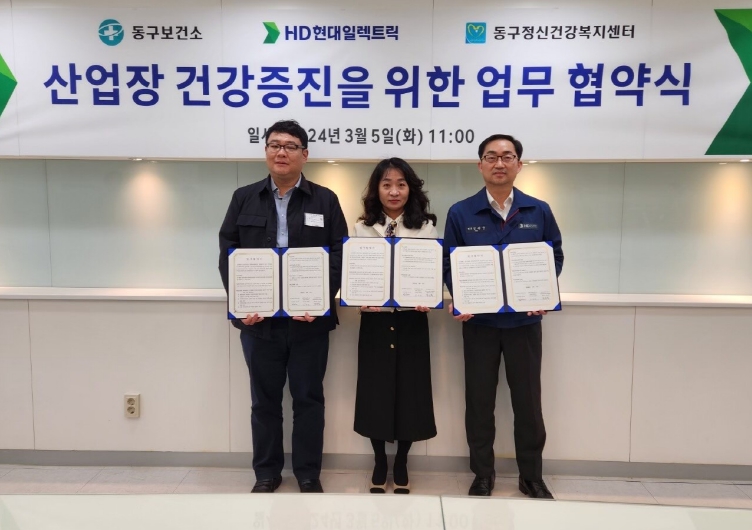 이번 협약은 지역 내 외국인 노동자 및 취약 노동자의 증가에 대응하여 지역 내 산업체와 건강증진 업무 협력의 필요성에 따라 추진됐으며, 협약식에는 동구보건소 보건소장, 현대일렉트릭 경영지원부문장, 동구 정신건강복지센터 센터장과 관계자들이 참석했다.