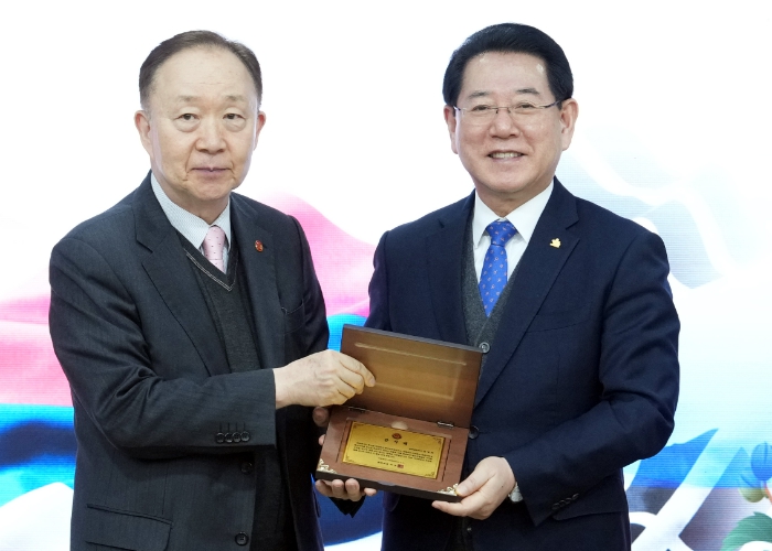 ![]() 김영록 전라남도지사가 5일 도청 서재필실에서 열린 ‘독립운동 미서훈자 발굴 및 서훈신청 설명회’에서 광역지자체 최초로 시작한 전남 독립운동 미서훈자 발굴사업이 전국적인 독립운동가 발굴에 대한 관심이 확대됨에 따른 공로로 광복회 김능진 부회장으로부터 감사패를 받고 있다. |