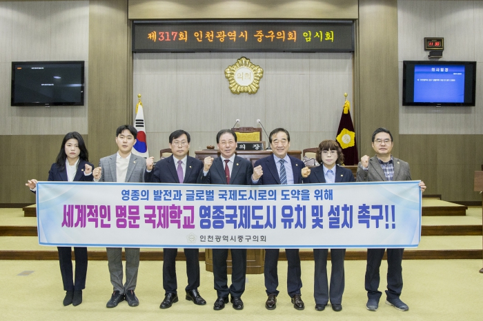 강후공 의장을 비롯한 중구의회 전 의원은 성명서를 통해 “골든테라시티(舊 미단시티)가 순조롭게 개발되고 영종국제도시가 세계적인 도시로 발전하기 위해서는 외국인 정주여건 마련, 외국인 투자 유치, 영종 도시개발 촉진, 글로벌 인재 양성, 해외 유학생 유치 등이 절실히 필요하며, 이를 위해 세계적인 명문 국제학교를 유치하는 일이 시급하다”라고 적시했다.