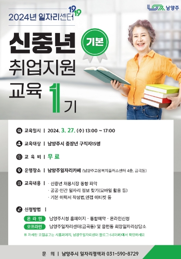 남양주시에 주소를 둔 중장년 누구나 참여 가능하며, 3월 7일부터 시 홈페이지 통합예약 시스템에서 온라인 신청하거나 가까운 읍·면·동 희망일자리상담소에 방문 신청하면 된다.
