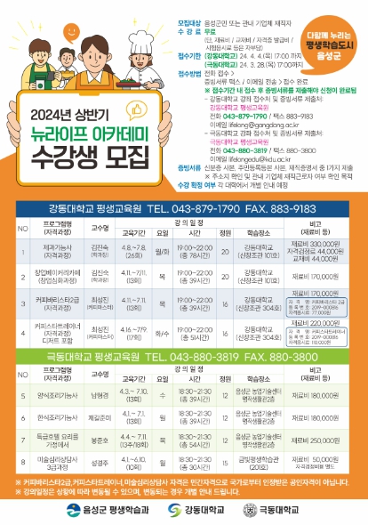 특히 올해는 음성군민의 접근성 편의를 위해 양식·한식조리기능사, ‘특급호텔요리를 가정에서’ 과정은 농업기술센터 음성명작생활관(음성읍)에서 미술심리상담사과정은 금빛 평생학습관(금왕읍)에서 운영한다.