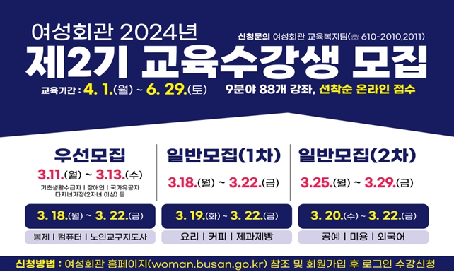 18세 이상 부산시민이라면 누구나 수강 신청할 수 있으며, 부산시 여성회관 누리집을 통해 선착순으로 접수 진행한다.