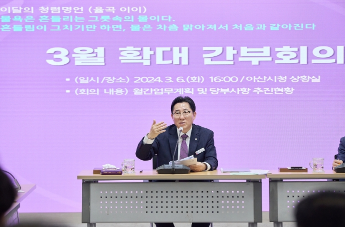 박경귀 시장은 이달(3월)의 ‘청렴톡톡 메시지’로 율곡 이이의 청렴 명언을 전달하며 “탁한 흙탕물도 시간이 지나면 가라앉아 윗물이 맑아지듯이 공직자는 항상 물욕에 흔들리지 않아야 하고 어떠한 유혹과 청탁도 이겨내도록 청렴을 생활화해야 한다”며 시민이 신뢰하는 공직 분위기 조성에 앞장서주기를 당부했다.
